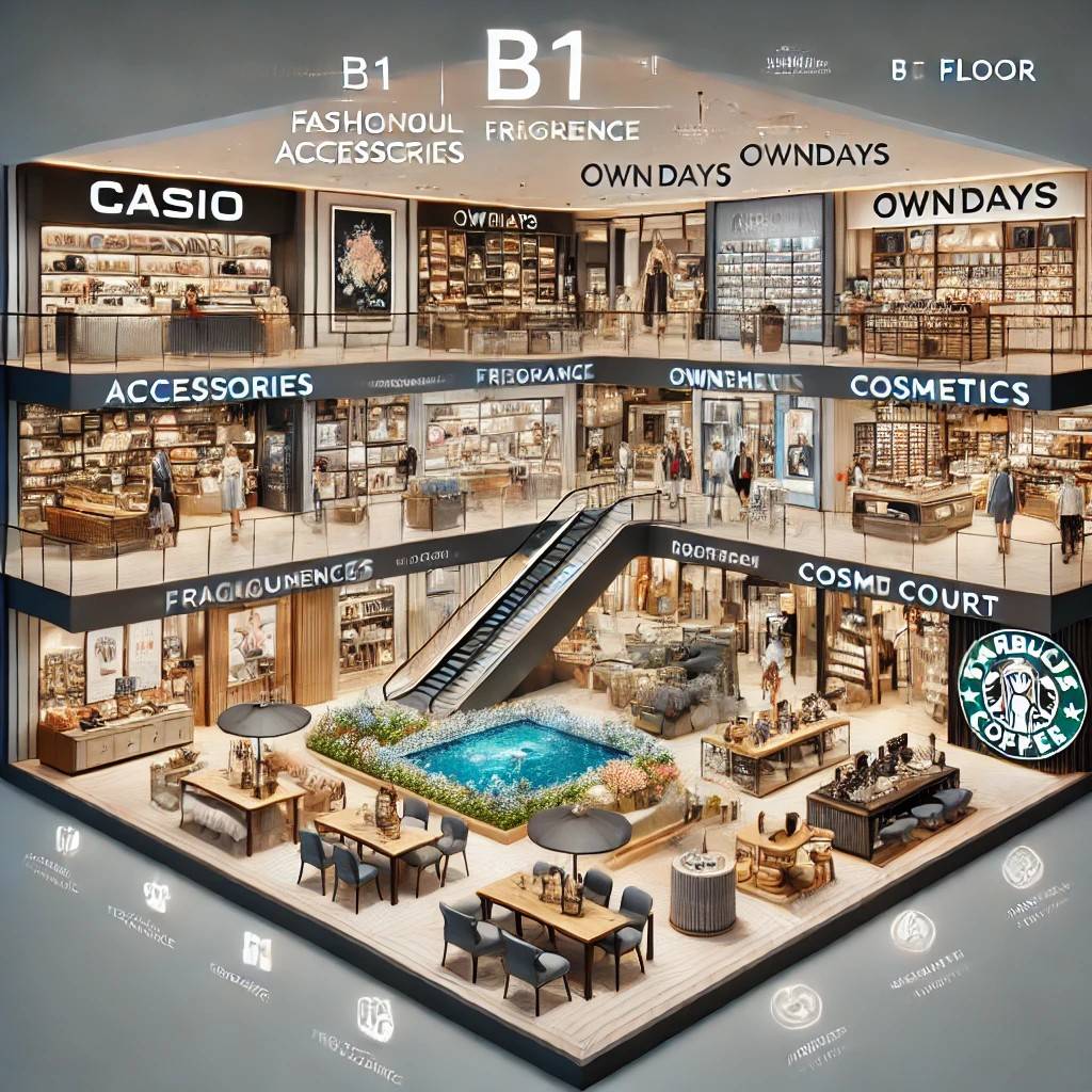B1:新潮少女服飾配件、香氛化妝品、美食街。品牌包括:CASIO、E-WEAR、gonnaEXPRESS、Heather、Keds、innisfree、OWNDAYS、ROCKCOCO、STARBUCKS COFFEE。