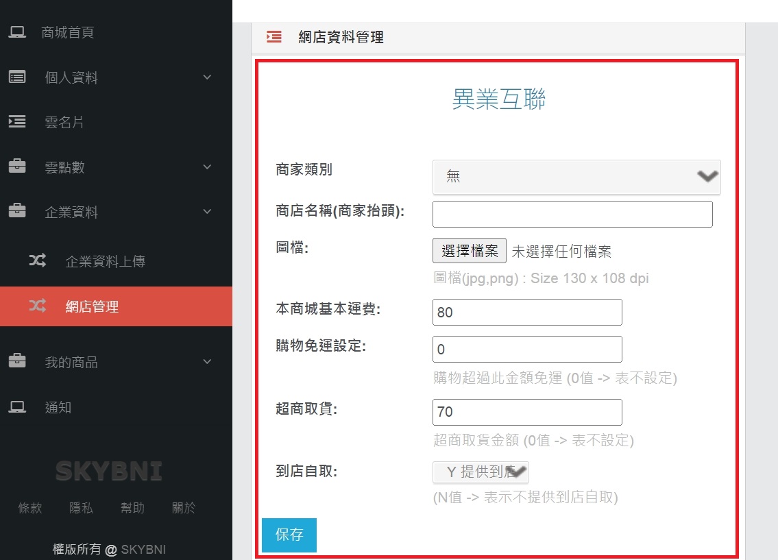 在下方可以調整網店九宮格,其中購物網與旅遊網不可更動,公司基本資料與街側網店廣告只能更改圖片,其他欄位都可隨意更改